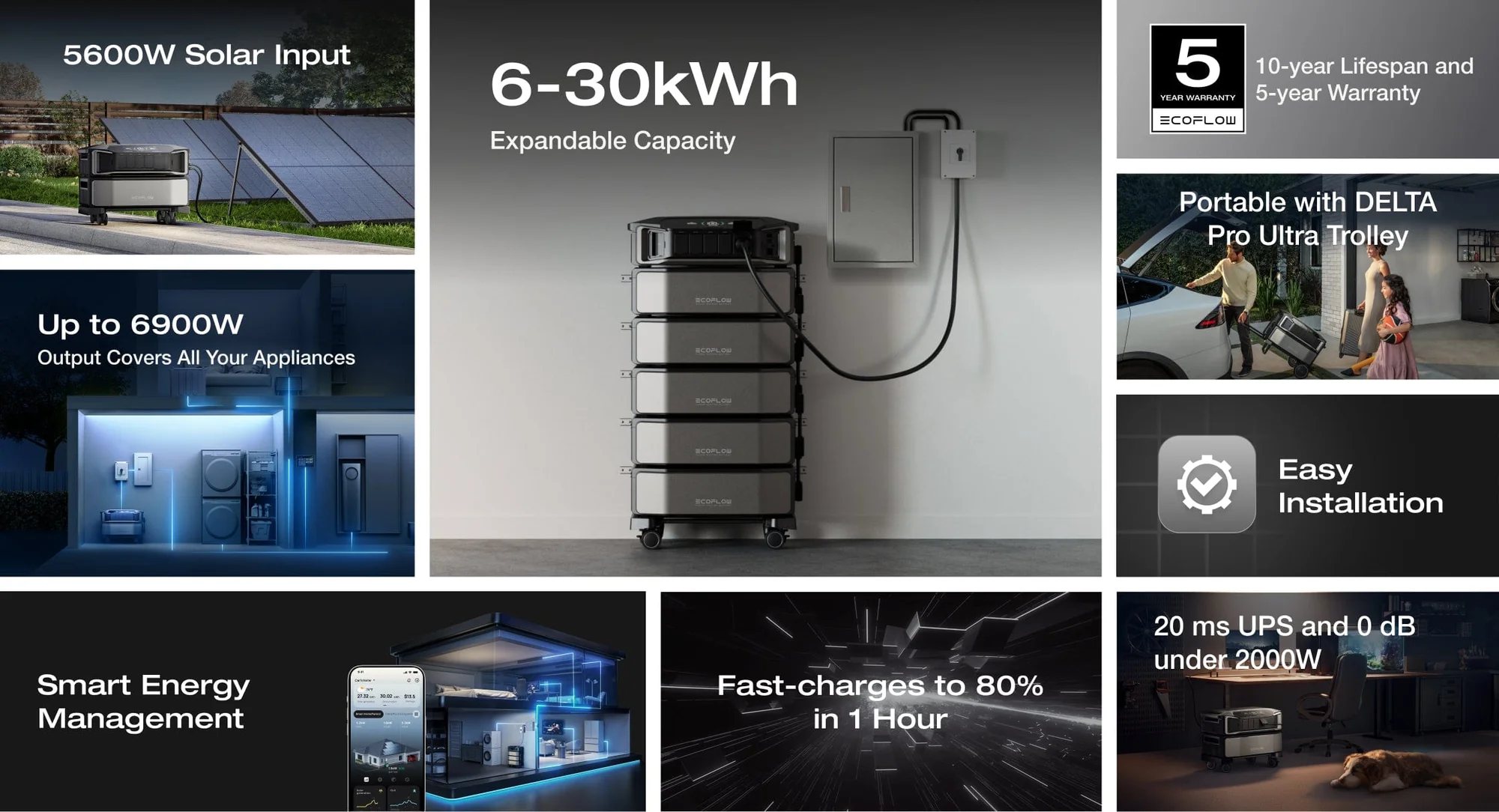 Paceliet mājas enerģijas drošību nākamajā līmenī ar līdz pat 30 kWh akumulatora kapacitāti. Parastai mājsaimniecībai tas nozīmē nedēļām ilgu būtisko ierīču darbības nodrošinājumu — lai gaisma un tādas ierīces kā ledusskapis turpina darboties (ilgums var atšķirties). Sakraujams un vietu taupošs dizains ļauj to ērti novietot garāžā vai saimniecības telpā.