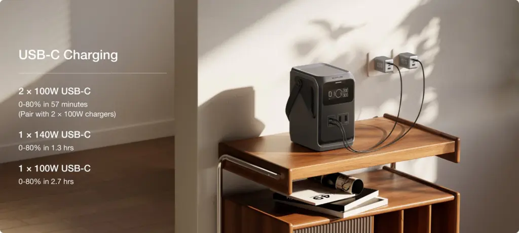 Uzlādējiet caur 140 W PD USB-C portu un baudiet enerģiju brīvā dabā jebkur, jebkurā laikā ar TRAIL.