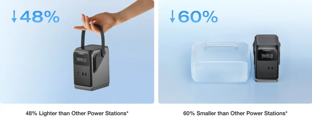 TRAIL 200 DC ir par 48% vieglāks un par 60% mazāks nekā EcoFlow RIVER 3 ar līdzīgu jaudas kapacitāti.