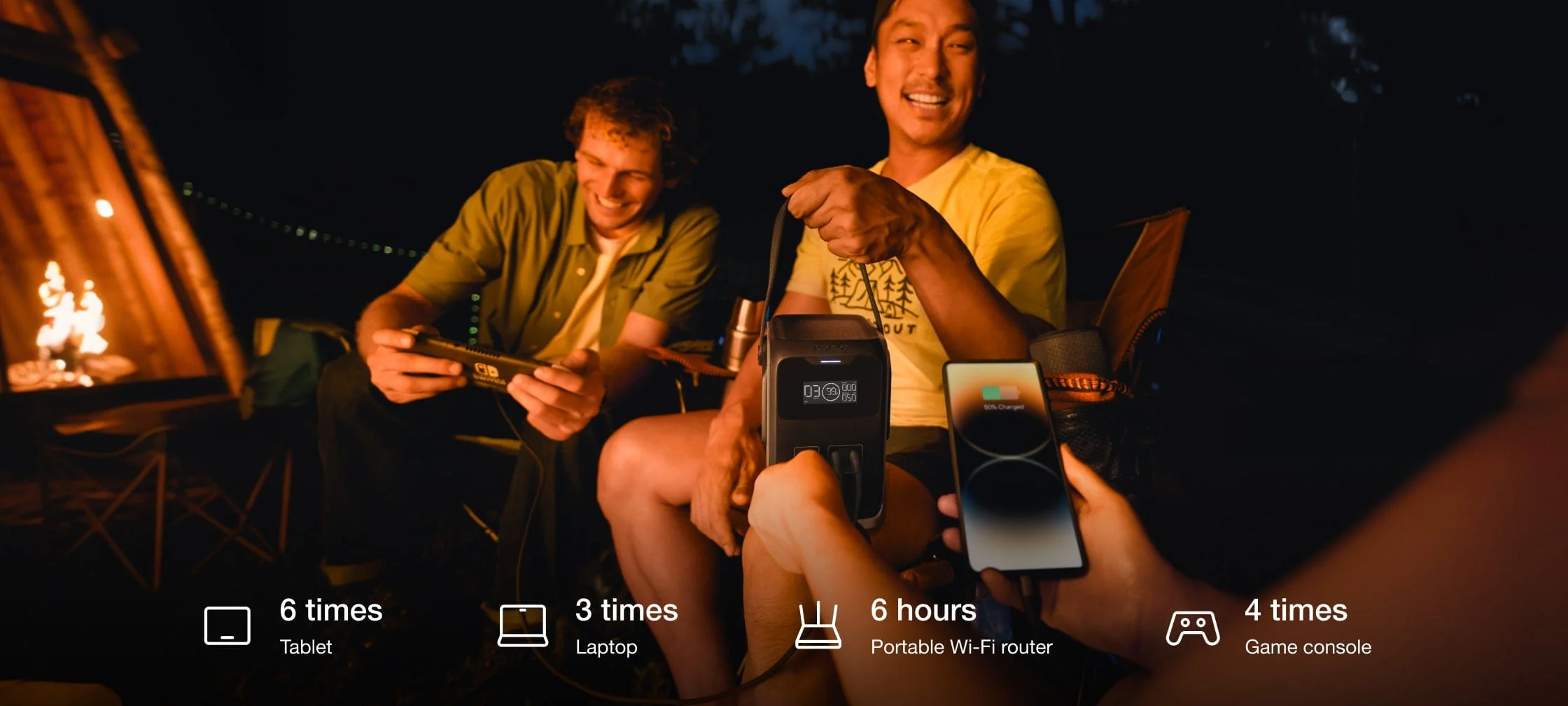 Ar 192 Wh (60 000 mAh) ietilpību — kas atbilst sešām parastām powerbankām vienā — TRAIL 200 DC bez piepūles uzlādē arī draugu ierīces.
